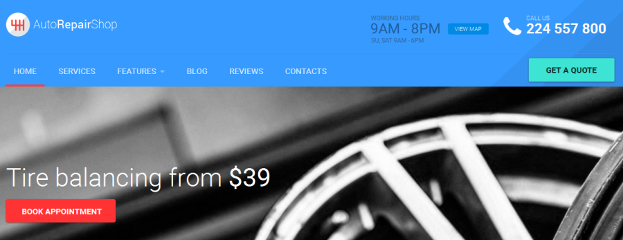 The Auto Repair theme by Cohhe has nice calls to action (although the menus are not sticky). You can access the admin panel in sandbox mode here – the options are somewhat limited in settings, but the site is bundled with Visual Composer and Slider Revolution.