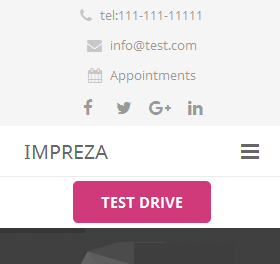Impreza Theme (link here) offers Calls to Action in both the main menu (highlighted button) and the Action Bar (icon and link). The theme offers numerous sliding-scale (height) options for both the Header and Action Bar areas, and options to make both or either sticky. The action bar is visible on mobile view. For menu buttons, see using a button for menu item. A button can also be configured in Visual Composer to show only on mobile or tablet devices (as in the ‘Test Drive’ button to right).