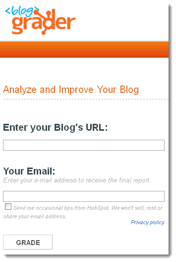 Grade your blog or website with Hubspot’s BlogGrader. Your site is graded on a 0-100 point scale, with an itemized list of strong points and weak points. Try it: here: